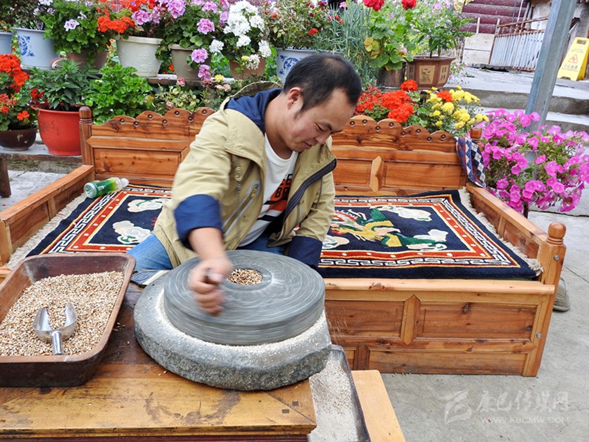 扎呷介紹說:水淘糌粑的制作工藝非常講究,分四步。首先要選用優(yōu)質(zhì)青稞風干篩好,放入山泉水中洗凈、曬干,再用熱水淘洗,瀝干水分趁熱裝人麻袋密封,保持恒溫,放上一夜。第二天,燒熱平底大炒鍋,揭開麻袋自然會聞到一股酒香味,然后倒人炒鍋,不停翻炒。炒青稞關(guān)鍵要掌握好火候,不焦不生,出現(xiàn)青裸花后就炒好了。待炒好的青稞冷卻后,裝入皮口袋,送到磨房,經(jīng)水磨磨出的糌粑,粉細、色澤潔白、味香可口。