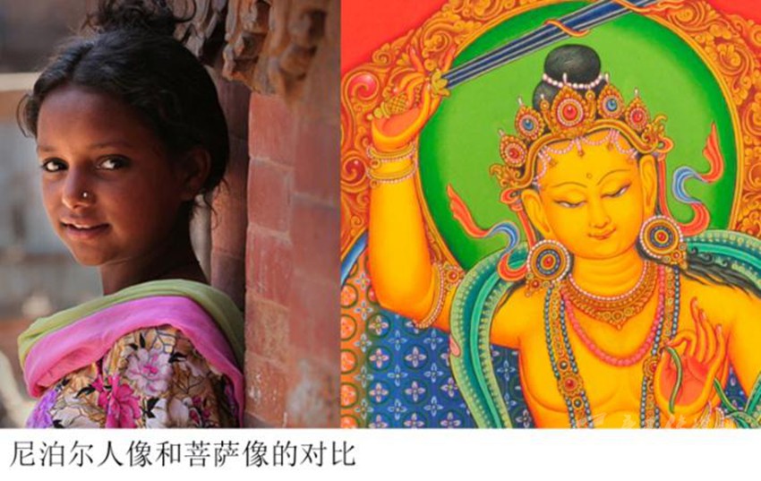 特別值得注意的是:之前佛教藝術(shù)的帕拉風(fēng)格繪畫中的臉型普遍是方正偏長的,而在尼瓦爾唐卡里,臉型普遍是方正偏短。偏短的方臉會讓五官顯得更加集中一點,特別是眉額比較大、眼睛位置下移,這樣的感覺有點近似于嬰兒的面部比例。而眉骨、鼻骨高挺,又不似兒童,這樣的面部特征其實和尼國人的長相比較接近。也許是尼瓦爾人善于觀察、擅長描摹的天分,逐漸把本民族沉靜的性格與容貌,潛移默化地滲透進(jìn)了唐卡,產(chǎn)生了新的風(fēng)貌。