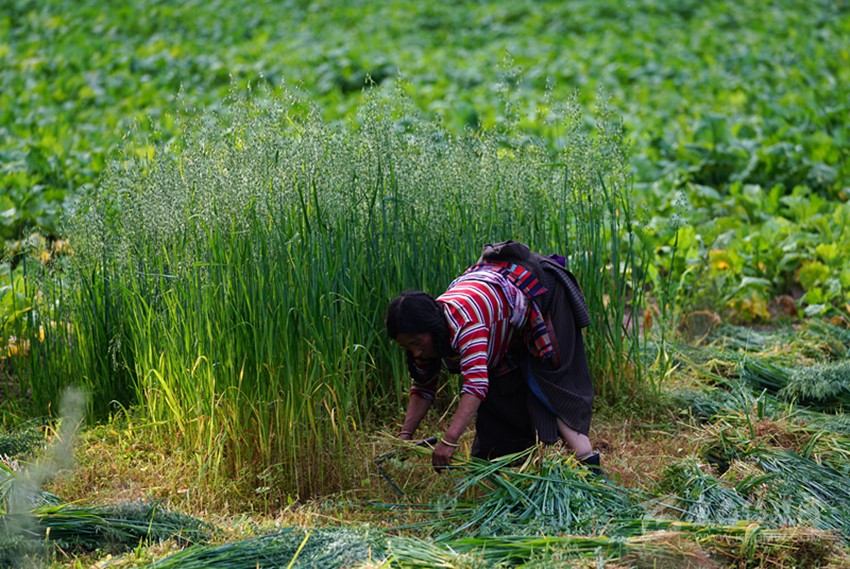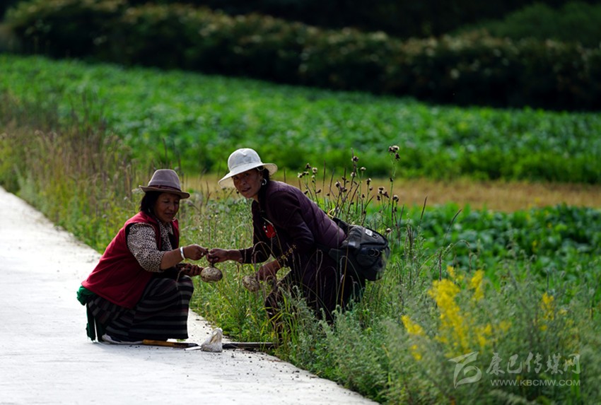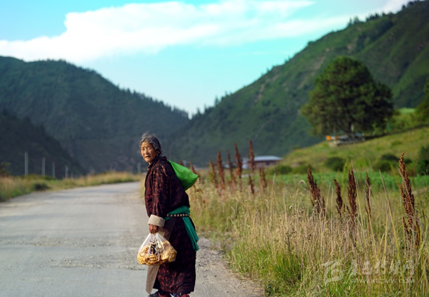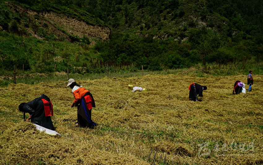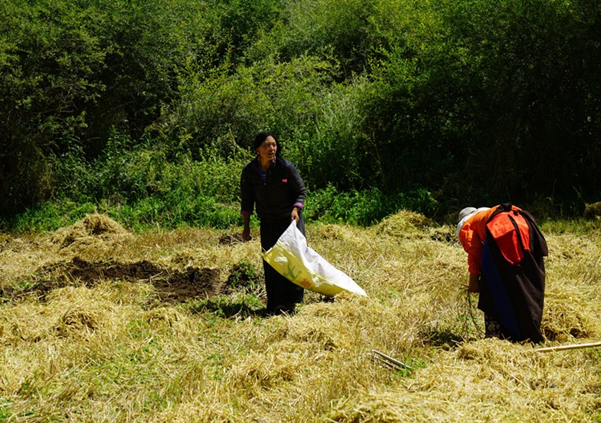 開(kāi)始收割了,從坡地到川地,到處是收割機(jī)的聲音。青稞是車巴溝的主要作物,因?yàn)橐デ囡?,要吃糌粑。村里人忙得團(tuán)團(tuán)轉(zhuǎn),收割機(jī)開(kāi)過(guò)去,大家就跟在后面撿穗子。如此往復(fù),一直要到糧食拉到家里。