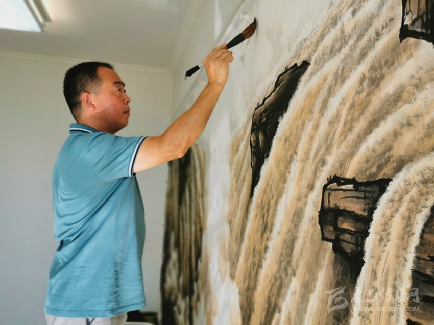 整面的雪白墻壁上,安掛著巨幅畫作《黃河在咆哮》。這幅長達(dá)5米多,寬近2米的畫作著實的大,裴宏波需要邊畫邊休息,否則體力不夠。完成河水的著色后,裴宏波停筆下梯,聊起了另一畫作——“康定新八景”,這正是記者此行的目的。