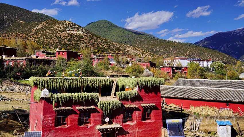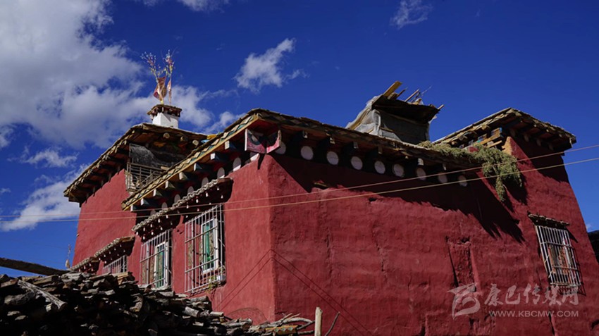 外裝飾也不繁復(fù)。外墻用磚紅色粘土調(diào)成泥漿上色,現(xiàn)在多用化學(xué)顏料。大門(mén)用一種叫“抓”的天然礦物質(zhì)涂料,這種顏料容易染色,挨一挨都會(huì)讓衣服沾上絳紅色,現(xiàn)在也用化學(xué)涂料代替。二樓與“砸口樓”檐口處裸露在外面的木頭,用漆絳紅色顏料涂抹,支出來(lái)的小圓木涂白色顏料。遠(yuǎn)遠(yuǎn)望去,紅白相間,錯(cuò)落有致,巴塘方言藏語(yǔ)稱(chēng)之為“東椎”。檐口頂上用排成“人”字形的小青瓦點(diǎn)綴,窗框和門(mén)框都涂成絳紅色,也用“東椎”與青瓦裝飾;有條件的人家安裝雕花窗棱,嫌麻煩就用普通的大格子窗。外置庭院,種花植木,一座傳統(tǒng)的紅藏房便竣工了。