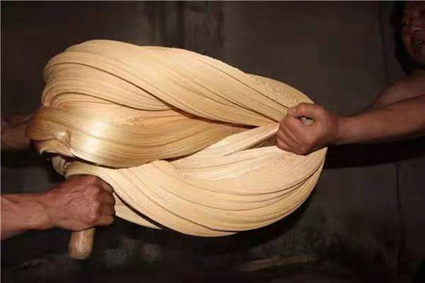 扯糖也是熬糖過(guò)程中十分關(guān)鍵的一個(gè)環(huán)節(jié)。剛出鍋的糖溫度可達(dá)兩三百度,徒手是不敢去觸碰的,扯糖需等到麻糖變得溫?zé)岵拍苓M(jìn)行,但又必須在它完全冷卻之前完成整個(gè)扯糖工序,否則等麻糖徹底冷卻就會(huì)變得僵硬無(wú)比。休息少頃,只見(jiàn)三叔熟練的用粘著面粉的手從盛放麻糖的簸箕中扯下三四斤左右的一團(tuán)麻糖,左手拿糖右手持杖(類(lèi)似于搟面杖的木棍)作出扯糖的姿勢(shì),此時(shí)四叔拿著早已準(zhǔn)備好的沾了面粉的木棍將三叔的手中的麻糖攔腰別住,用力均勻的拉扯麻糖,三叔則在原地扎樁站穩(wěn),一手持杖作拉扯狀,一手微微扶住想要往下掉的糖尾,經(jīng)過(guò)幾次折疊和來(lái)回拉扯,麻糖變得均勻細(xì)長(zhǎng),兩人合力將扯好的麻糖平穩(wěn)的放在鋪有熟面粉的大簸箕中靜待冷卻。間隙二叔和父親又重復(fù)著扯糖的動(dòng)作,很快將一團(tuán)糖餅扯成糖帶。經(jīng)過(guò)拉扯后麻糖中間會(huì)形成很多的空洞,吃起來(lái)酥脆香甜。