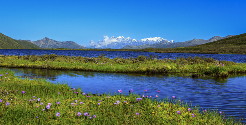 在山谷中穿行十余公里,路面一點(diǎn)點(diǎn)抬起,上了貢嘎山脈,徑直進(jìn)入康定情歌景區(qū)。隨著海拔的升高,涼意漸濃。山依舊是主角,地勢(shì)卻變得平緩而開闊,有茵茵的草地,有大小湖泊,沿途山泉潺潺,野花點(diǎn)綴,空氣清幽,方才單調(diào)的褐色很快被淡忘。山體漸次出現(xiàn)密集而低矮的灌木,枝條筆直地立著,有高寒山區(qū)的凜然之氣。灌木一層層上延,樹木雜多,大片的原始森林漫過山體,將大山包裹起來。遠(yuǎn)處,藍(lán)天白云之下,貢嘎雪山在群峰中探出頭來,擦亮高空的陽光。澄明的空氣里,仿佛可以聽見雪??┛┑匦Αx那間,仿佛所有的大山,都開始舒展筋骨。