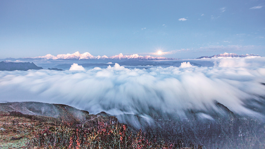 這是天上貢嘎寬大為懷、兼容并包的不凡氣度。它以獨(dú)具魅力和氣吞山河的雄偉壯麗,以及無(wú)法憾動(dòng)的王者之軀,包容并呵護(hù)著無(wú)數(shù)群峰、千溝萬(wàn)壑、萬(wàn)物生靈和諧共生共處,展現(xiàn)出一幕幕眾山拱衛(wèi)下精致的山岳大戲。如此這般,既把自身推向了高點(diǎn),又使依偎在身邊甚至遠(yuǎn)處的萬(wàn)物生靈各得其所、各展其長(zhǎng)、各有所獲。