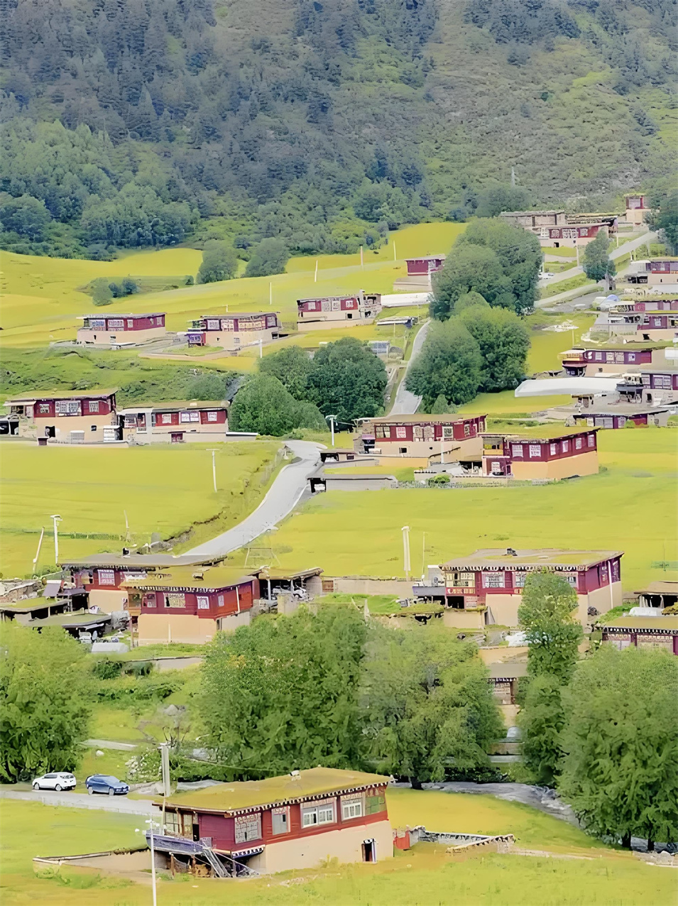 眼前,河谷兩旁的青山上,長滿參天古樹,像一個個衛(wèi)士守護著這片綠洲;沙魯里山脈的冰雪融水順著蜿蜒的麥曲河,澆灌著兩旁綠意蔥籠的青稞地、豌豆地,滋潤著彌漫香味的種有中藏藥材的土地;絳紅色藏房散落在河谷間,不時有小孩打開窗戶,探出小腦袋,羞澀地露出滿臉燦爛的笑容;臉上布滿高原紅的阿姐沖我們打招呼,說著我們不太懂的藏語,充滿熱情。