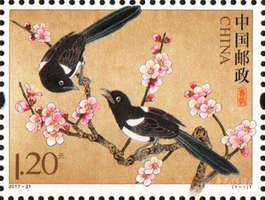 中國(guó)郵政定于2017年8月28日發(fā)行的《喜鵲》特種郵票。