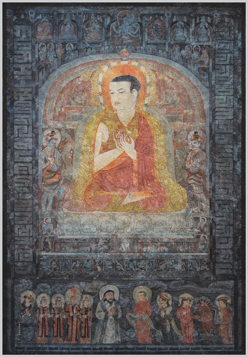 從“三怙主”往兩邊發(fā)展,分別是早期“薩迦五祖”中的前“四祖”:初祖貢噶寧布(1092--1158年);二祖索南孜摩(1142--1182年),三祖扎巴堅贊(1147--1216年),四祖貢噶堅贊(1180--1251年),即“薩迦班智達”。而薩迦第五祖就是畫面正中的八思巴(1235--1280年)。根據(jù)藏文史料,薩迦五祖中的前三祖稱為“白衣三祖”,因為他們都沒有正式出家受比丘戒,而是身著俗衣以居士身份自居;后二祖稱為“紅衣二祖”,因為他倆正式出家為僧,受過比丘戒,身著紅色袈裟。1253年夏天,忽必烈的軍隊到達六盤山一帶,請八思巴到軍營一敘,雖然有的史書記載之前八思巴就與忽必烈見過面,但這次是八思巴第一次以薩迦教主身份正式會見忽必烈。畫面的下方表現(xiàn)的就是“六盤山相會”的歷史場景。畫面右邊是八思巴一行列隊迎接的場面。中間著紅色吐蕃服裝者即是八思巴,他手捧哈達、神情莊嚴的給忽必烈獻上哈達,紅色吐蕃衣服暗示他當時還未受比丘戒的“紅衣”身份;在他身后哈達搭肩、雙手合十者為其弟恰那多吉,藏青色衣服暗示他的俗人身份;隊列后面是兩位服侍教主的僧侶,他們頭戴吐蕃氈帽、牽馬負笈等候在一旁。左邊是蒙古王族的儀仗隊列,為首便是身著白色裘衣的忽必烈。其后是三個侍女簇擁著的察必王妃,第一位侍女扶著代表皇族的華蓋,而淡青色華蓋說明:忽必烈當時尚未繼承蒙古大汗位。察必王妃和侍女皆穿著紅色的蒙古弘吉剌部落服裝,所不同的是王妃服飾比侍女服飾更顯尊貴和優(yōu)雅;隊伍的最后是一位穿著青衣、佩戴短刀的蒙古侍衛(wèi)。整個蒙古王族隊列面對將來的帝師八思巴,大家都謙遜、虔誠、靜穆地雙手合十致意。忽必烈、察必王妃以及八思巴的形象是根據(jù)古代繪畫作品和文字描述而創(chuàng)作的,服飾、用具、民風民俗也都經(jīng)過仔細的研究考證。畫面兩邊是用“八思巴文”的字母組成的紀念柱,彰顯八思巴創(chuàng)立“蒙古新字”的功勛。受忽必烈指派,八思巴借鑒藏文拼讀方式創(chuàng)制出由41個字母構成的一種新文字,其語音拼讀均按蒙語,又稱“八思巴蒙文”。八思巴向忽必烈呈獻蒙古新字后,忽必烈極為高興,并於1268年下詔,凡是詔書及各地方公文等均必須使用蒙古新字,在全國范圍內(nèi)推行這種新文字。