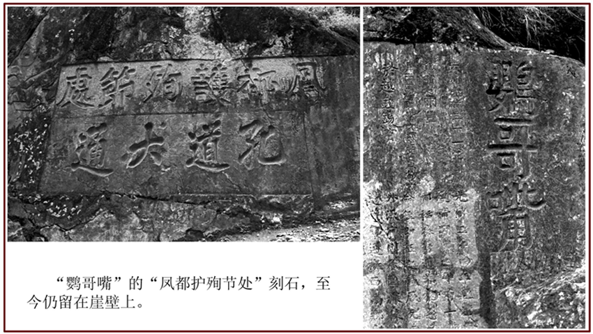 緊靠“鸚哥嘴”的,便是兩行從右至左、一上一下的橫書巨刻:“鳳都護殉節(jié)處”和“孔道大通”。它分明詔告世人,當年那埸把康巴藏區(qū)鬧得個地覆天翻的大戲,便是從這里揭幕的。