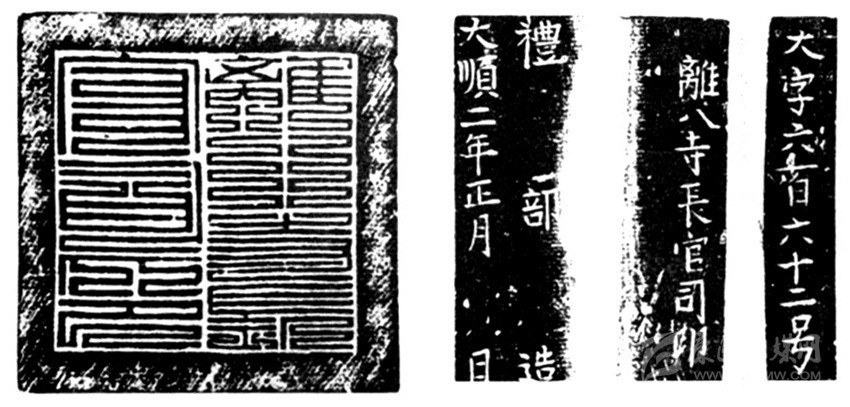 “離八寺官司印”為大西政權(quán)官印,大順二年(1645)鎏金銅制九疊篆印章。高約6CM, 規(guī)格7×7,印章正面邊款鑄文“大字六百六十二號(hào) 離八寺長(zhǎng)官司印”,側(cè)刻“禮部造 大順二年正月 日”,評(píng)為國(guó)家一級(jí)文物。史書(shū)載:“獻(xiàn)忠遍招諸土司,用降人為誘,鑄金印赍之,以易其官?!币虼丝赏茢?,此印為大西政權(quán)控制川西少數(shù)民族所鑄。