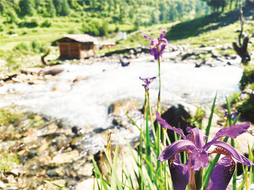 我走出木屋,朝著流動的水聲去梳洗。三兩只藍綠色的鳥兒立在插入溪水溝里的一截木槽上低頭飲水,抬頭鳴唱,見到人影,撲棱棱幾聲飛進了不遠處的一片淺樹叢里,沒了蹤跡。一層薄薄的白霧正從牧場后方皺褶起伏的山頂漫溢下來,湮沒了黛青色的山石、綠色的小杜鵑樹叢,接著湮沒了整個牧場,眼前一片空茫,耳邊只有溪水婉轉流向遠處的聲音。我蹲下身,把手伸進溪水里,由雪水融化的沁涼很快冷冽到了骨頭里,再往深處,觸摸到一個個光滑的圓石。浸泡久了,溪水開始變得柔軟溫暖起來,掬一捧洗臉,那清爽仿佛能使我一眼看開眼前的云霧,看清那些停立于山頂石礫之上的灰色獐子和樹叢深處悄然綻開的紫色貝母花,花瓣上星星點點的白是它與生俱來的喜色。