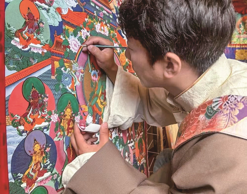 “唐卡作為中國民族繪畫藝術(shù)的珍品,不僅呈現(xiàn)精湛的技藝和美學,更是傳遞一種文化?!睏畹潜硎荆鳛橐幻h級非遺傳承人,要在繼承傳統(tǒng)技藝的基礎上,采用多元藝術(shù)技藝賦予傳統(tǒng)唐卡更多創(chuàng)意,讓民族文化瑰寶能夠更好地發(fā)揚光大。
