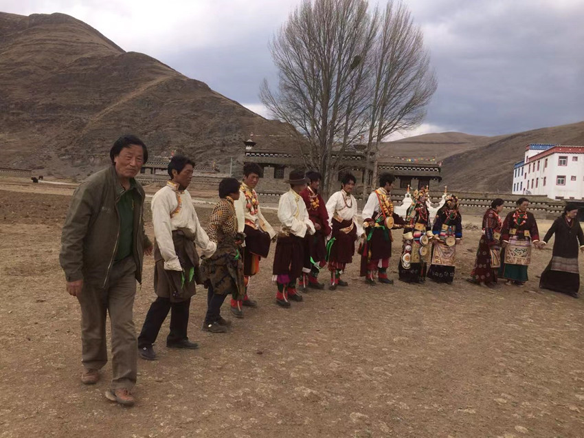 盡管,秋加措不喜歡跳舞,但藝術(shù)的種子卻貌似很早便深埋于他的血液里了。秋加措出生在德格鄉(xiāng)下國道317線邊上一個叫龔埡的小村莊,全村約四十戶人家。盡管村莊很小,但村里卻有著濃厚的藝術(shù)氛圍。當時農(nóng)村土地公有,實行合作社制,出工都是集休行動,因此,在中間休息時,能歌善舞者就會舞蹈或唱歌。而每逢節(jié)日,人們匯集于曬場,曬場中間燃起篝火,男女各自分邊組隊,跳起本地特有的鍋莊舞,常常一跳就是數(shù)日。通常跳鍋莊舞都有領(lǐng)舞,由當?shù)啬芨枭莆枵邠?,秋加措的母親是他們村領(lǐng)舞者之一。每當夜晚大人們?nèi)计痼艋?,跳起鍋莊時,秋加措便和小伙伴們圍坐在火塘邊看大人們舞蹈。也許在潛移默化中,音樂對秋加措產(chǎn)生了深刻的影響,不知不覺中對藝術(shù)親近了。