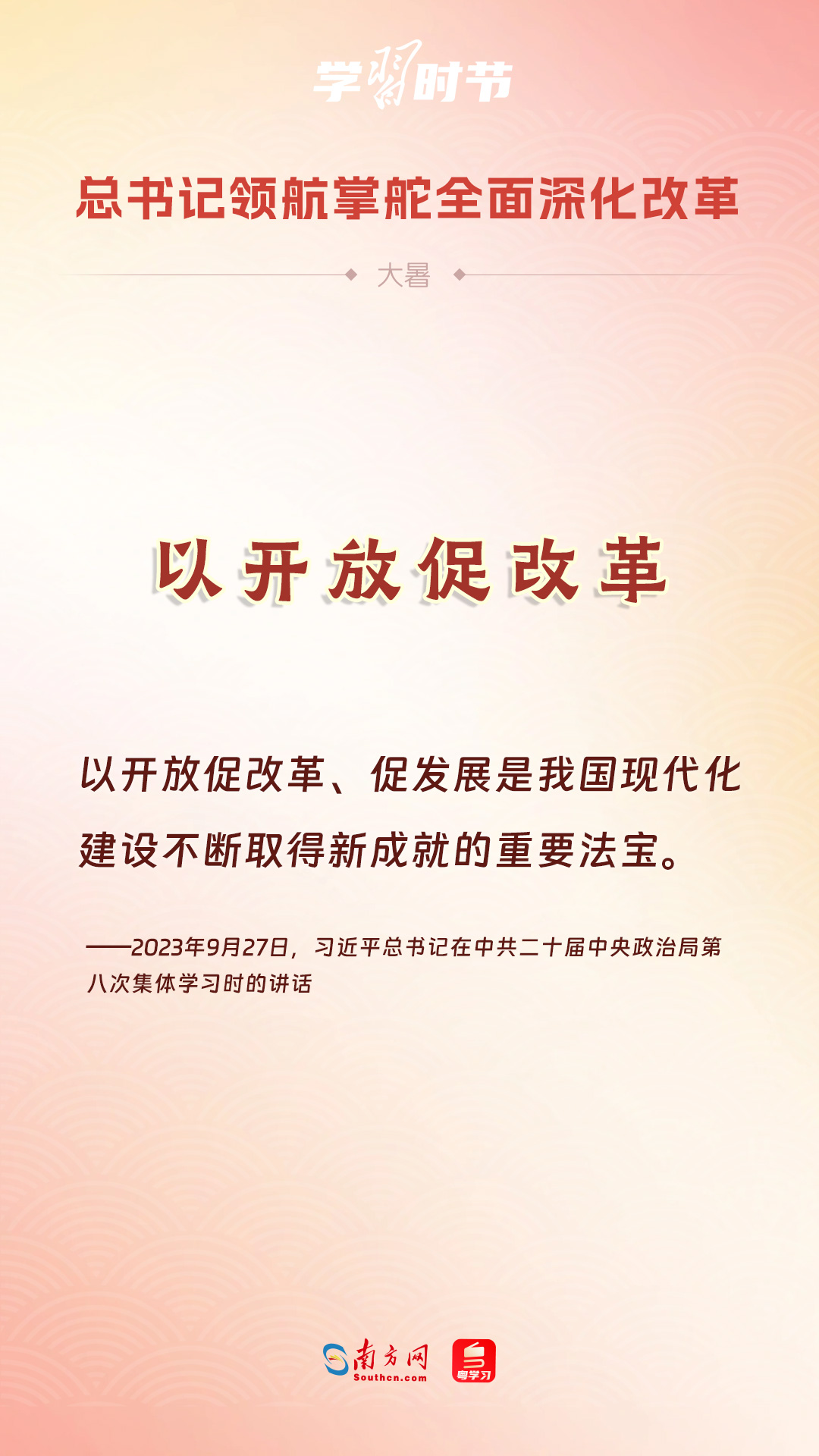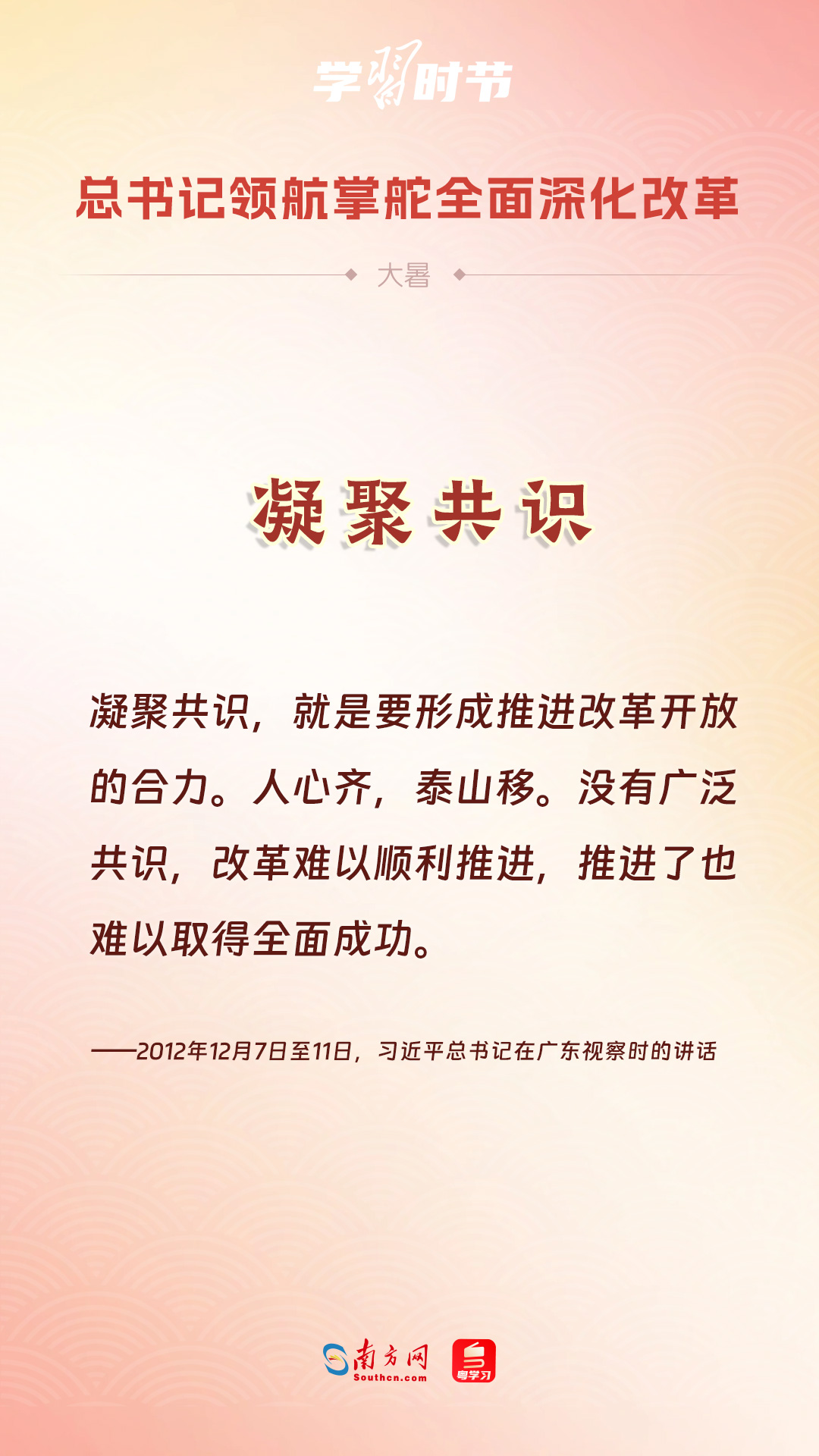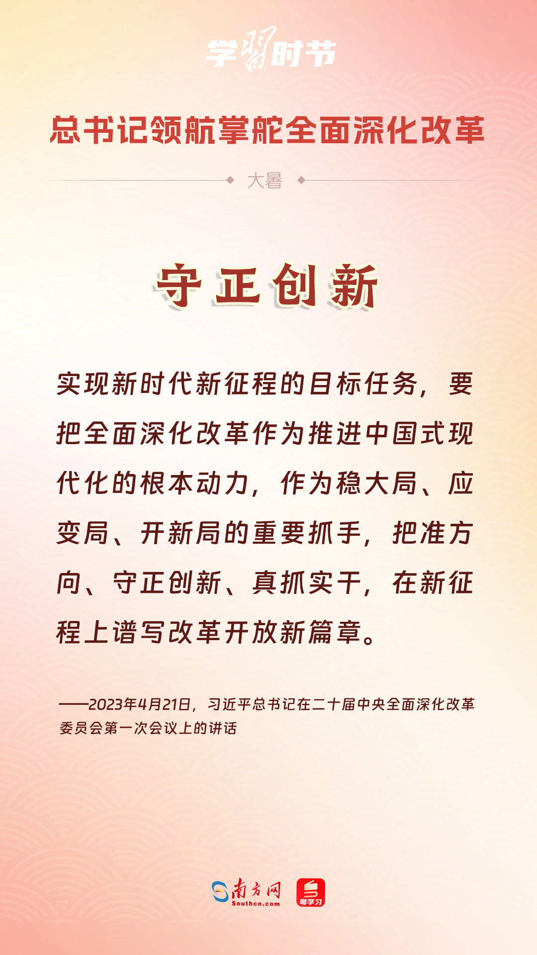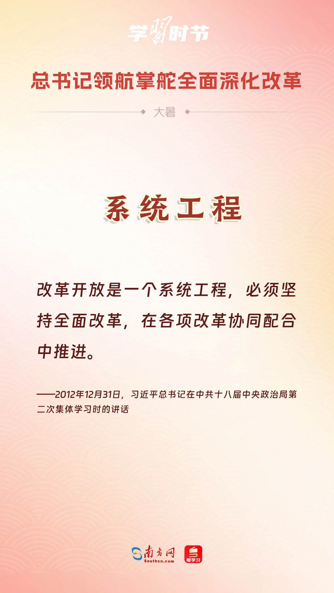 黨的十八大以來,習近平總書記親自領(lǐng)導、親自部署、親自推動全面深化改革工作,推動全面深化改革事業(yè)在攻堅克難中不斷邁上新臺階、取得新勝利。在驕陽似火的大暑時節(jié),通過一組海報,讓我們共同學習習近平總書記關(guān)于“全面深化改革”的重要論述。