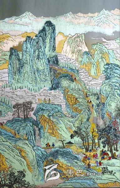 在蜀錦蜀繡展覽館中,由蜀錦大師馬德坤,蜀繡大師鄔學強共同創(chuàng)作大型錦繡作品《南方絲路圖》,吸引不少游客駐足。該作品天空部分的藍色由深及淺,并逐步過渡到表現(xiàn)地面的泥金色。同時,利用絲織品的透光性,使遠山和近景形成強烈對比,大大地增強了畫面的縱深感。