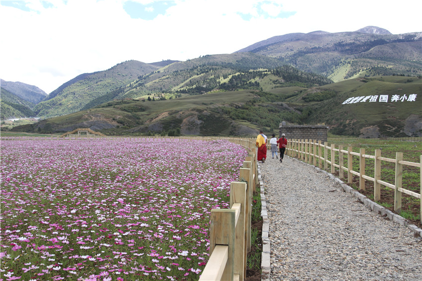 去年,在我州理塘縣濯桑鄉(xiāng)漢戈村, 當(dāng)?shù)貭幦「鞣劫Y金,利用旅游區(qū)位優(yōu)勢和老百姓群策群力,打造了占地800多畝、以波斯菊為主的漢戈花海,配套修建了賽馬場、游客中心、鍋莊廣場等。從去年國慶開始,漢戈花村開門迎客,鮮花留住了游客,也留住了收入。