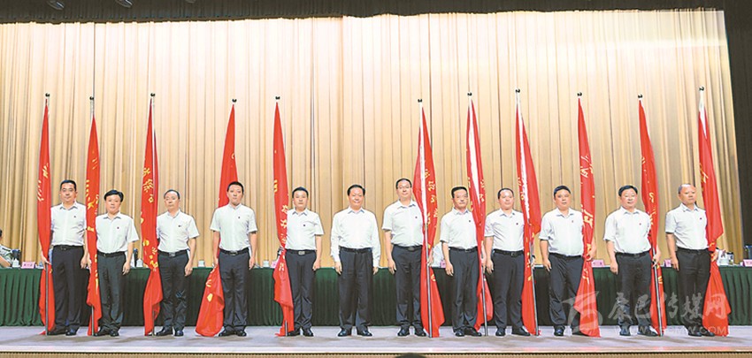 6月20日,省綜合幫扶涼山州打贏脫貧攻堅(jiān)戰(zhàn)動(dòng)員大會(huì)在西昌召開。省委書記彭清華向11個(gè)脫貧攻堅(jiān)綜合幫扶工作隊(duì)授旗。 四川日?qǐng)?bào)記者 歐陽杰 攝