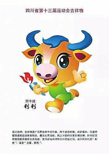 吉祥物是廣元野生羚牛娃形象。羚牛姿態(tài)挺拔,威武雄壯,凸顯矯健快速的運(yùn)動(dòng)體育特點(diǎn),展現(xiàn)無(wú)畏艱險(xiǎn)、向上沖勁和體育拼搏精神。羚牛娃面帶微笑,敞開(kāi)胸懷大步向前,充滿好客熱情和吉祥祝福之情。名字利利代表“利州”,諧音“力量、勝利”。