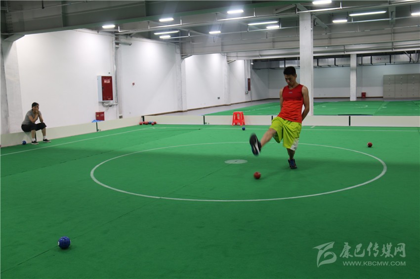 記者隨后被工作人員帶到了蹴球訓練場地,只見在一個10米×10米的正方形平地上,一個運動員腳跟著地,用腳掌擠壓球,去擊中場內球。