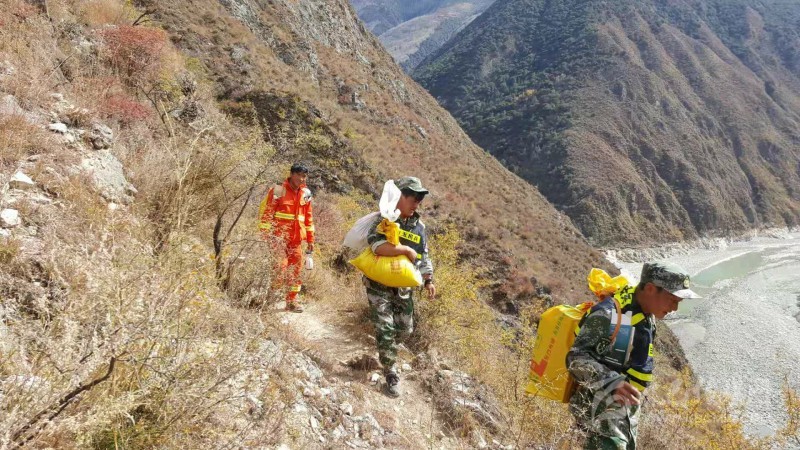 會(huì)議結(jié)束后,由白玉縣縣長(zhǎng)阿央鄧珠和縣委副書記胥東帶隊(duì)的11人突擊隊(duì)就出發(fā)了。在地圖上,從白玉縣城到堰塞體的直線距離只有20公里左右,但在崇山峻嶺之中,想要順利抵達(dá)極其艱難。乘車只能到達(dá)距離江邊7.5公里左右的則巴村,剩下的路程則全是布滿灌木叢的陡坡峭壁。隊(duì)伍借用了當(dāng)?shù)卮迕竦哪ν熊嚕^續(xù)冒險(xiǎn)前進(jìn)。