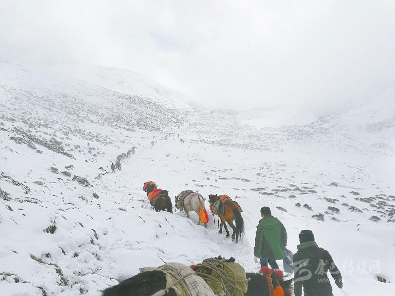 成都市雙流區(qū)對(duì)口支援甘孜州巴塘縣的援藏干部們下鄉(xiāng)途中翻越海拔5503米的拉瑪拉雪山。 韓國(guó)梁 攝