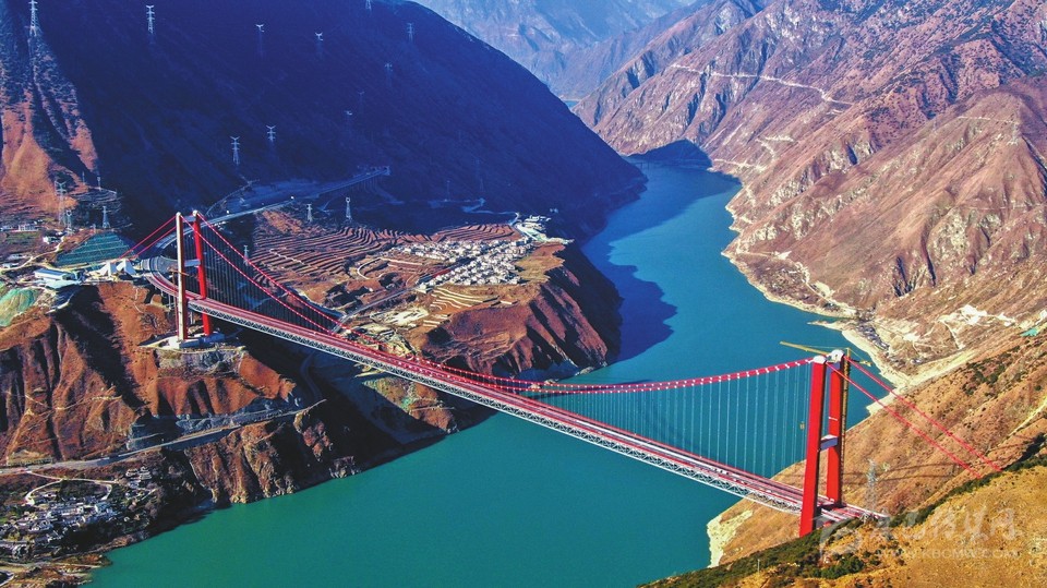 興康特大橋作為一座超大跨徑鋼桁梁懸索橋,是成都平原進入甘孜藏區(qū)的第一座高速公路特大橋,橋面至大渡河水面高239米。記者站在大橋一側(cè),感受到了這座大橋的雄壯之美。高原上藍(lán)天白云,披上“紅妝”的大橋在陽光照射下,熠熠生輝,更顯宏偉。