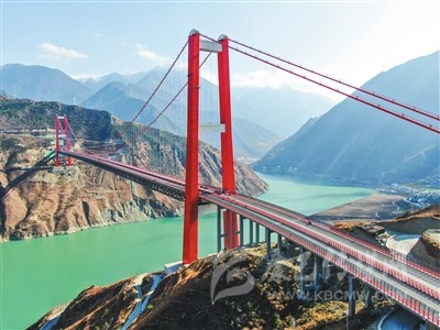 而在瀘定大渡河特大橋康定岸約200米處的公路堡坎上,寫著毛澤東主席的《七律·長征》一詩。一句“大渡橋橫鐵索寒”道出了大渡河的艱險(xiǎn),而如今,在這波濤洶涌的大河上,建起了如此雄偉的大橋,解決了出行難題,帶來了福祉,將促進(jìn)藏區(qū)經(jīng)濟(jì)社會(huì)發(fā)展,真是讓“高原人民盡開顏”。