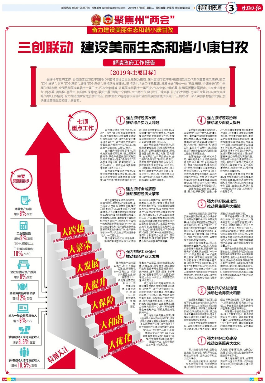 肖友才指出,今年發(fā)展形勢更加復(fù)雜、發(fā)展任務(wù)更加繁重,我們必須緊緊抓住大有可為的重要戰(zhàn)略機遇期和政策紅利“窗口期”,統(tǒng)籌兼顧、突出重點、突破難點,全力保持經(jīng)濟社會高速度與高質(zhì)量并重發(fā)展良好態(tài)勢,重點做好以下工作:一是強力抓好經(jīng)濟發(fā)展,推動綜合實力大跨越。堅持把項目投資作為推動高質(zhì)量發(fā)展的重中之重,全力確保完成全社會固定資產(chǎn)投資460億元以上、地區(qū)生產(chǎn)總值突破“三百億”大關(guān);深化商貿(mào)流通領(lǐng)域改革,強力拓展消費市場,健全“圣潔甘孜”產(chǎn)品質(zhì)量標準體系,實現(xiàn)社會消費品零售總額112億元以上;堅定不移支持民營經(jīng)濟發(fā)展,力爭民營經(jīng)濟市場主體突破6萬戶、民營企業(yè)突破8000戶,民營經(jīng)濟增加值占GDP比重達到48%以上;堅持以供給側(cè)結(jié)構(gòu)性改革為主線,強力推動各項改革任務(wù)落地見效。二是強力抓好全域旅游,推動旅游經(jīng)濟大繁榮。堅定不移實施產(chǎn)業(yè)富民戰(zhàn)略,全力推進以全域旅游為核心的生態(tài)優(yōu)先、綠色發(fā)展,強力構(gòu)建“三環(huán)一帶兩濕地”發(fā)展格局,全力打造世界重要旅游目的地和國家全域旅游示范區(qū);堅持把建設(shè)國際生態(tài)文化旅游目的地作為重要工作,全力打響中國最美雪山、中國最美濕地、中國最美草原、中國最美藏寨、中國最美漢子“五張名片”,強力培育生態(tài)文化旅游品牌。三是強力抓好工業(yè)強州,推動特色產(chǎn)業(yè)大發(fā)展。堅定不移實施工業(yè)強州戰(zhàn)略,堅持“優(yōu)先發(fā)展新興產(chǎn)業(yè)、大力發(fā)展農(nóng)特加工產(chǎn)業(yè)、有序發(fā)展電礦產(chǎn)業(yè),大建園區(qū)、建大園區(qū),大建基地、建大基地,大建產(chǎn)業(yè)、建大產(chǎn)業(yè)”思路,強力推進產(chǎn)業(yè)向園區(qū)集中;堅持以建設(shè)國家級清潔能源基地為統(tǒng)攬,積極穩(wěn)妥開發(fā)礦產(chǎn)資源,積極發(fā)展戰(zhàn)略性新興產(chǎn)業(yè),強力推進電礦向高端集群;堅持以建設(shè)現(xiàn)代高原特色農(nóng)牧業(yè)基地為重點,深入推進農(nóng)業(yè)供給側(cè)結(jié)構(gòu)性改革,強力推進龍頭向基地集聚。四是強力抓好統(tǒng)籌協(xié)調(diào),推動城鄉(xiāng)面貌大提升。堅定不移實施城鄉(xiāng)提升戰(zhàn)略,堅持“七管齊下”“四態(tài)合一”的思路,做強縣城、做優(yōu)鄉(xiāng)鎮(zhèn)、做美村寨,全面推進城鄉(xiāng)建設(shè)提檔升級;堅定不移實施鄉(xiāng)村振興戰(zhàn)略,編制完成全州鄉(xiāng)村振興戰(zhàn)略規(guī)劃和18個縣(市)鄉(xiāng)村振興規(guī)劃,全面推進鄉(xiāng)村振興試點示范;堅定不移實施交通先行戰(zhàn)略,強力打好第四輪“交通大會戰(zhàn)”,全面推進區(qū)域綜合交通樞紐;高標準編制災(zāi)后重建實施方案和項目清單,強力推進金沙江白格堰塞湖災(zāi)后恢復(fù)重建。五是強力抓好脫貧攻堅,推動民生民利大保障。堅定不移實施扶貧攻堅戰(zhàn)略,堅持把脫貧攻堅作為最大的政治責(zé)任、最大的民生工程、最大的發(fā)展機遇,決戰(zhàn)決勝脫貧攻堅;深入實施教學(xué)質(zhì)量提升工程,深化醫(yī)療衛(wèi)生體制改革,完善公共文化服務(wù)體系,全力辦好社會事業(yè);堅持就業(yè)優(yōu)先,大規(guī)模開展職業(yè)技能培訓(xùn),全面實施全民參保計劃,依法保障退役軍人合法權(quán)益,持續(xù)推進城鎮(zhèn)棚戶區(qū)改造,全力做好水電移民安置工作,筑牢社會保障體系;堅定不移實施生態(tài)文明建設(shè)戰(zhàn)略,嚴格落實“三線一單”制度,強力推進國家生態(tài)文明建設(shè)示范區(qū)創(chuàng)建,提升生態(tài)民生福祉。六是強力抓好依法治理,推動社會局面大和諧。堅定不移實施依法治州戰(zhàn)略,深化“三區(qū)”維穩(wěn)體系和依法常態(tài)化治理,深入開展反分裂斗爭,建設(shè)更高質(zhì)量的平安甘孜;堅定不移把社會管理納入法治化軌道,鞏固更加和諧的民族宗教關(guān)系;堅定不移落實安全生產(chǎn)“黨政同責(zé)、一崗雙責(zé)、齊抓共管、失職追責(zé)”責(zé)任制,構(gòu)建更大密度的安全監(jiān)管網(wǎng)絡(luò)。七是強力抓好自身建設(shè),推動政務(wù)服務(wù)大優(yōu)化。堅持依憲施政、依法治政,自覺運用法治思維和法治方式推進政府工作,堅決讓公平和正義成為常態(tài);完成新一輪政府機構(gòu)改革,形成職責(zé)明確、依法行政的政府治理體系,堅決用實干和效率贏得民心;全面落實從嚴治黨主體責(zé)任,把經(jīng)濟社會發(fā)展與黨風(fēng)廉政建設(shè)同部署、同安排、同考核,堅決把紀律和規(guī)矩挺在前面。