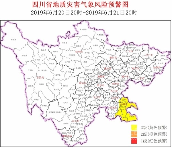 四川在線消息(記者 寇敏芳)6月20日,省自然資源廳發(fā)布全省地災(zāi)氣象風(fēng)險預(yù)警。結(jié)合四川省氣象臺天氣預(yù)報情況,6月20日20時~6月21日20時,全省地質(zhì)災(zāi)害氣象風(fēng)險預(yù)警等級為3級(黃色預(yù)警,注意級),具體結(jié)果如下:
