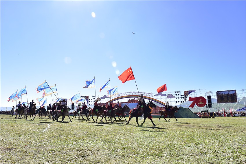 “四山旗似晴霞卷,萬馬蹄如驟雨來”。上午十點(diǎn),石渠縣四個(gè)片區(qū)組成的四個(gè)馬隊(duì)方陣高舉印有“世界最美濕地”“千年唐蕃古道”“石刻藝術(shù)王國(guó)”“吉祥太陽部落”字樣的四色彩旗,眾星拱月般簇?fù)碇腥A人民共和國(guó)國(guó)旗和慶祝中華人民共和國(guó)成立70周年活動(dòng)標(biāo)識(shí),策馬入場(chǎng),拉開了2019中國(guó)·石渠—太陽部落帳篷狂歡節(jié)的帷幕。