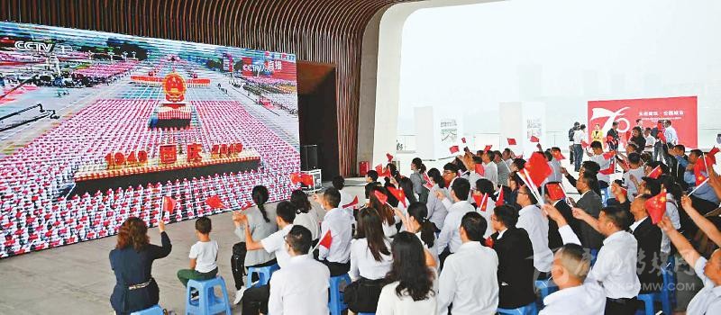 上午10時(shí),慶祝中華人民共和國(guó)成立70周年大會(huì)開(kāi)始。通過(guò)電視信號(hào),大會(huì)盛況傳遞至每個(gè)現(xiàn)場(chǎng)。“與祖國(guó)母親同在,祝福祖國(guó)繁榮昌盛?!边@是大家共同的心聲?!醣緢?bào)記者 林凌 何勤華 程文雯 徐中成 陳碧紅 文莎
