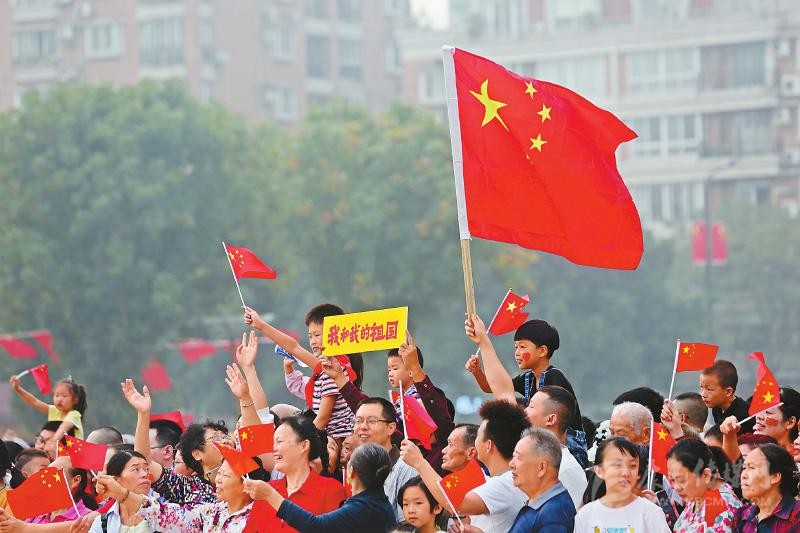 8時(shí)許,儀式正式開(kāi)始。當(dāng)鮮艷的國(guó)旗升至旗桿最高點(diǎn),現(xiàn)場(chǎng)爆發(fā)出熱烈的掌聲和歡呼聲?!拔覑?ài)你中國(guó)!”“祝偉大的祖國(guó)繁榮昌盛!”祝福聲此起彼伏。