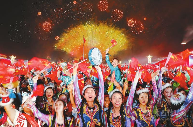 10月1日晚,天安門廣場火樹銀花、流光溢彩。習(xí)近平等黨和國家領(lǐng)導(dǎo)人來到天安門城樓,同各族各界群眾聯(lián)歡,共祝新中國70華誕。
