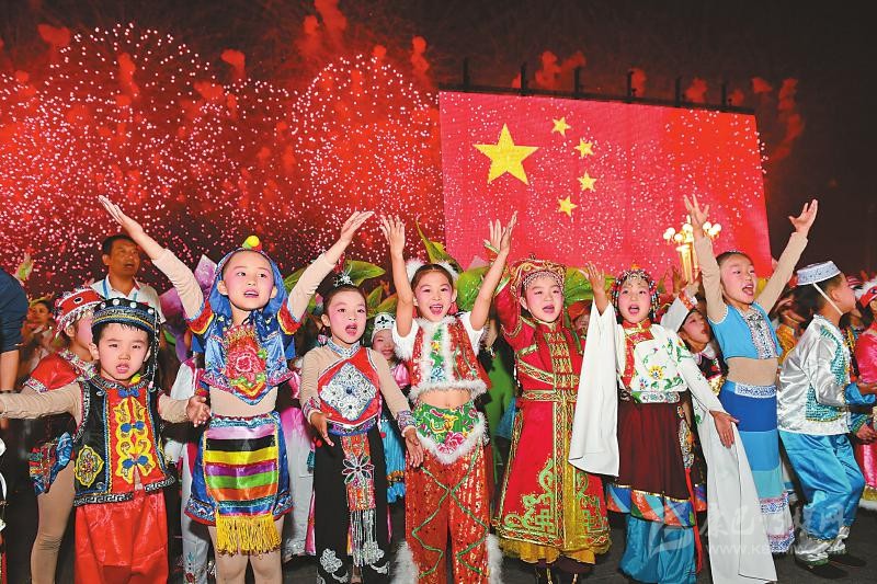 在世界最大的廣場,上演著一場特殊的“快閃”:少年兒童從金水橋走來,稚嫩的童聲響亮。國旗旗桿旁的戰(zhàn)士在唱,身著盛裝的各民族代表在唱,和睦幸福的一家人在唱……全場聯(lián)歡群眾和現(xiàn)場觀眾形成氣勢恢弘的大合唱。