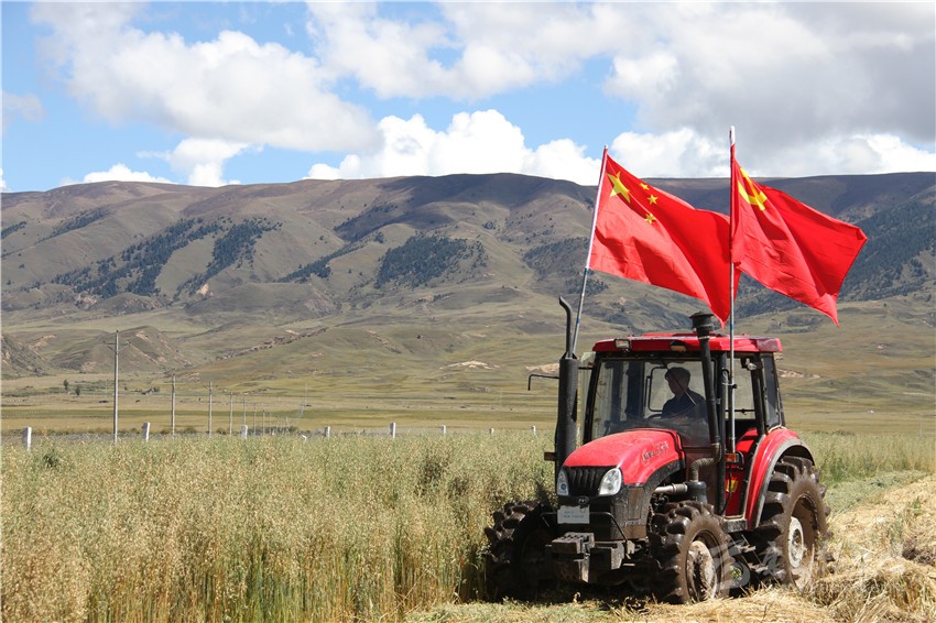 本網(wǎng)訊 10月3日,理塘縣藏壩鄉(xiāng)藏青扎喇人工飼草料基地,當(dāng)?shù)啬撩裨诟畈輽C上插上黨旗、國旗,感恩黨和祝福祖國。