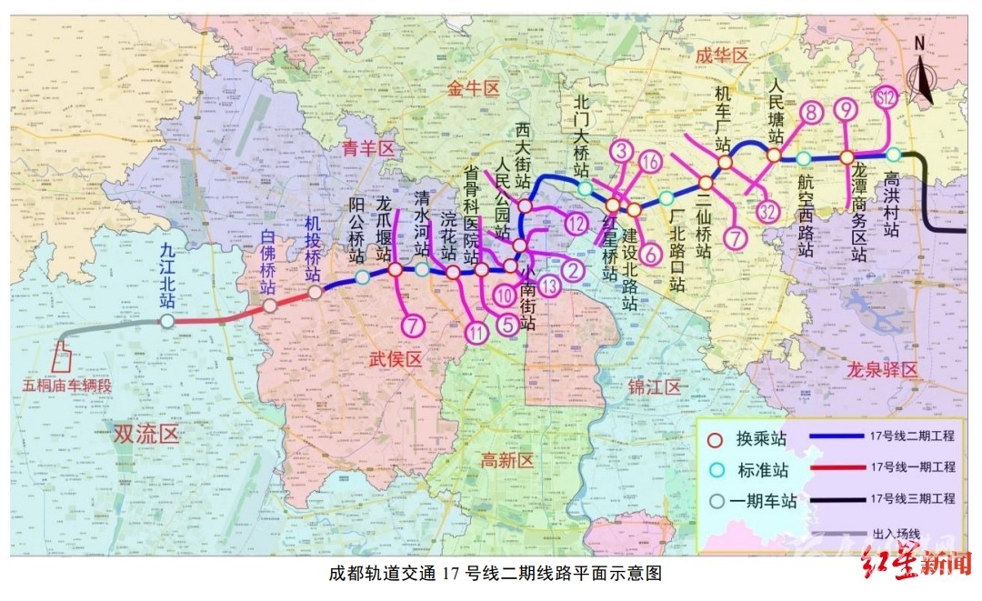 紅星新聞?dòng)浾吡私獾剑?7號(hào)線一期工程已于2017年1月開工建設(shè),計(jì)劃于2020年12月底建成投入試運(yùn)營(yíng)。本次環(huán)評(píng)公示的17號(hào)線二期工程位于成都市雙流區(qū)、武侯區(qū)、青羊區(qū)、金牛區(qū)和成華區(qū),工程起于一期工程機(jī)投橋站(不含),止于高洪片區(qū)的高洪村站(含),線路自西向東沿永康路-晉陽(yáng)路-龍騰東路-大石西路-小南街-北較場(chǎng)西路-成華街-張家巷-建設(shè)北路-二仙橋北路-航天路敷設(shè)。線路長(zhǎng)約24.8km,均為地下線路,共設(shè)置地下車站18座,其中有換乘站12座。