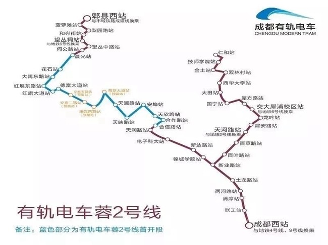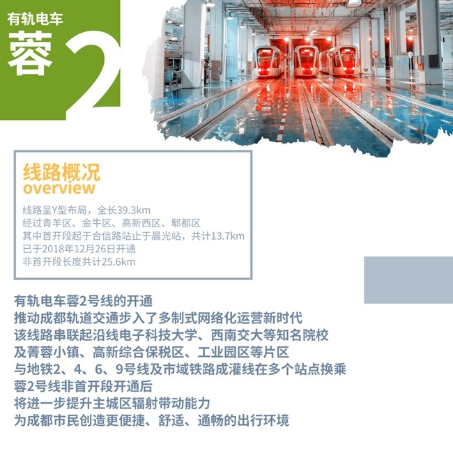 有軌電車蓉2號線工程線路呈Y型布局,線路經(jīng)過青羊區(qū)、金牛區(qū)、高新西區(qū)、郫都區(qū),線路全長39.3km。其中首開段起于合信路站,止于晨光站共計(jì)13.7km,已于2018年12月26日開通,非首開段長度共計(jì)25.6km。