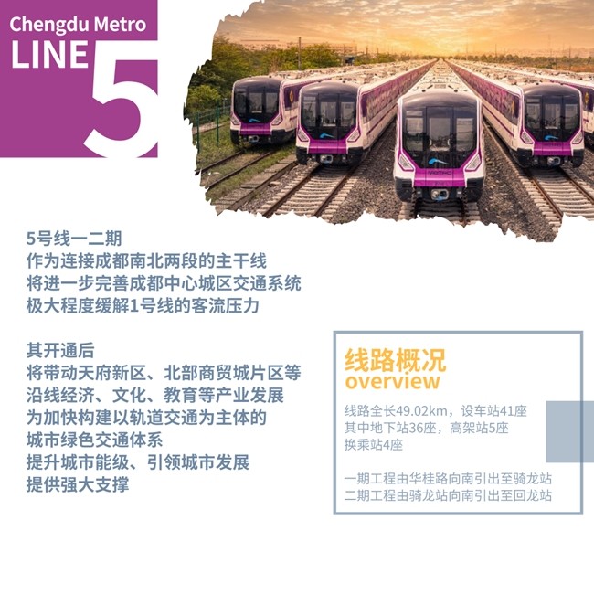 其中,5號線一二期作為連接成都南北兩段的主干線,將進(jìn)一步完善成都中心城區(qū)交通系統(tǒng),極大程度緩解1號線的客流壓力,其開通后將帶動天府新區(qū)、北部商貿(mào)城片區(qū)等沿線經(jīng)濟(jì)、文化、教育等產(chǎn)業(yè)發(fā)展,為加快構(gòu)建以軌道交通為主體的城市綠色交通體系,提升城市能級、引領(lǐng)城市發(fā)展提供強(qiáng)大支撐。