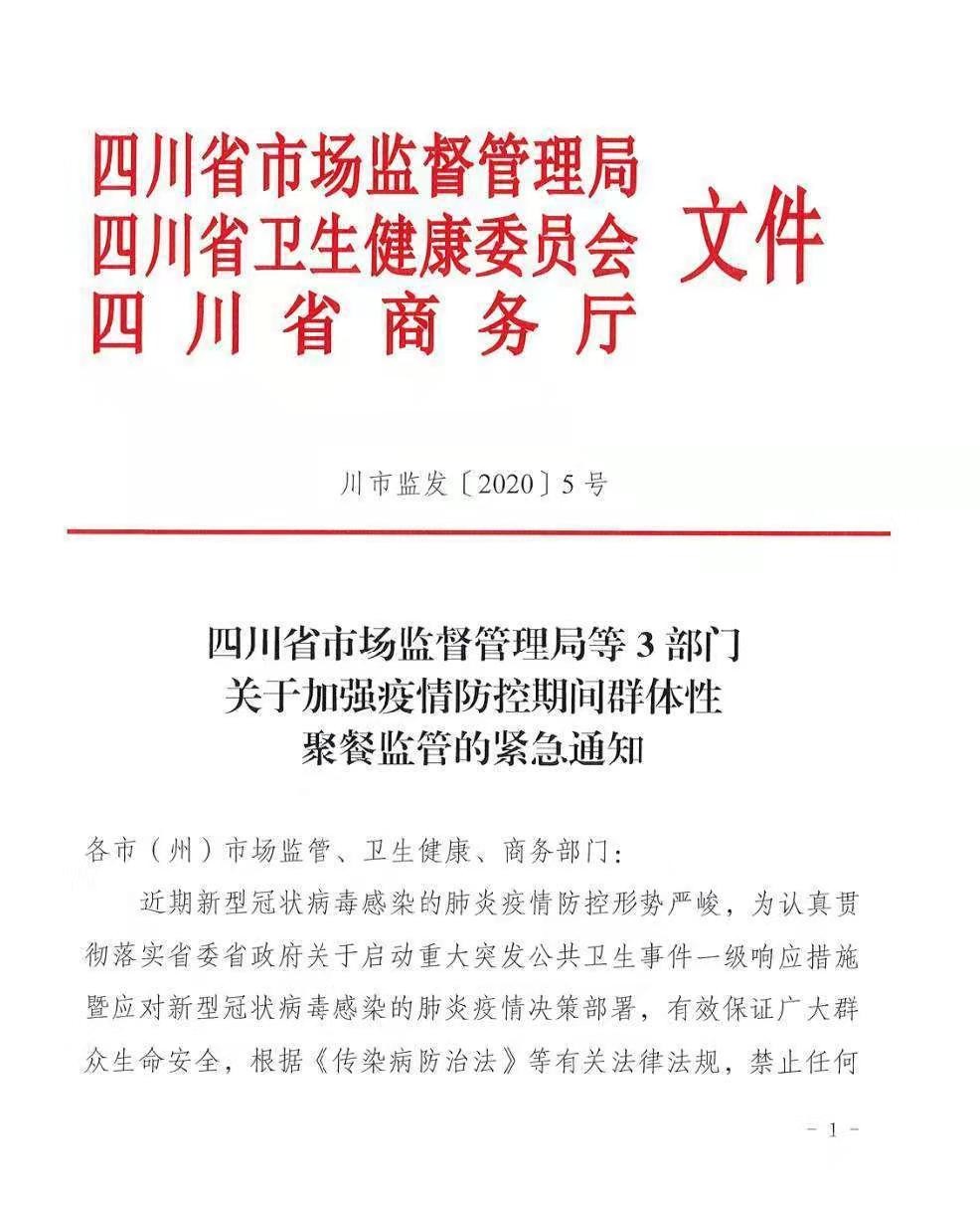 四川新聞網(wǎng)成都1月25日訊(記者 李丹)1月25日,四川省市場監(jiān)督管理局、四川省衛(wèi)生健康委員會(huì)、四川省商務(wù)廳3部門聯(lián)合發(fā)布緊急通知,近期新型冠狀病毒感染的肺炎疫情防控形勢嚴(yán)峻,為認(rèn)真貫徹落實(shí)省委省政府關(guān)于啟動(dòng)重大突發(fā)公共衛(wèi)生事件一級(jí)響應(yīng)措施暨應(yīng)對(duì)新型冠狀病毒感染的肺炎疫情決策部署,有效保證廣大群眾生命安全,根據(jù)《傳染病防治法》等有關(guān)法律法規(guī),禁止任何餐飲單位和個(gè)人舉辦任何形式的群體性聚餐活動(dòng),已經(jīng)訂餐的應(yīng)盡快取消或延期舉辦。