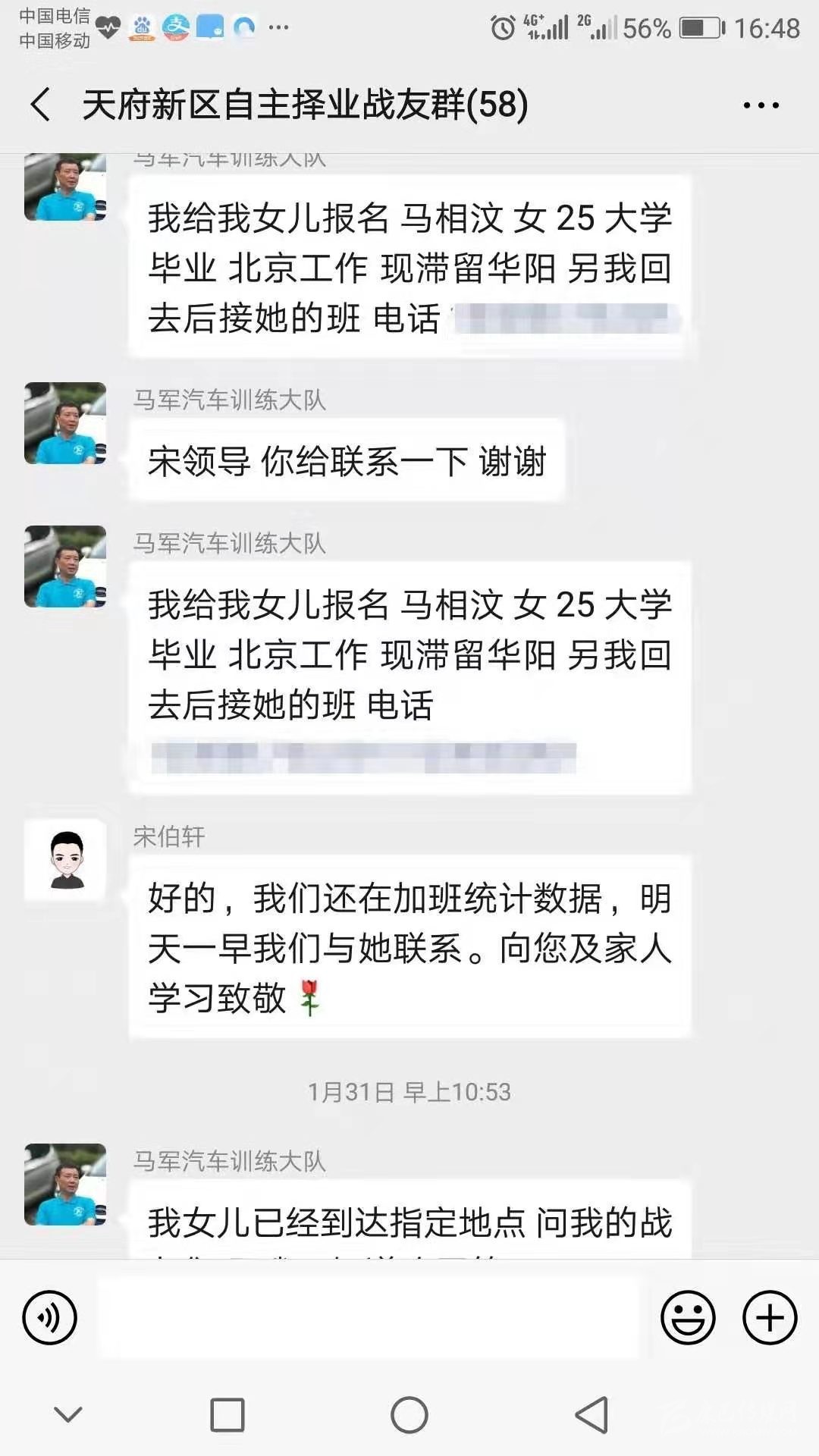 “我給我女兒報(bào)名,馬相汶,女,25歲,大學(xué)畢業(yè),北京工作,現(xiàn)滯留成都,另我回去后接她的班?!苯?,一條微信截圖傳遍了天府新區(qū)退役軍人的朋友圈。