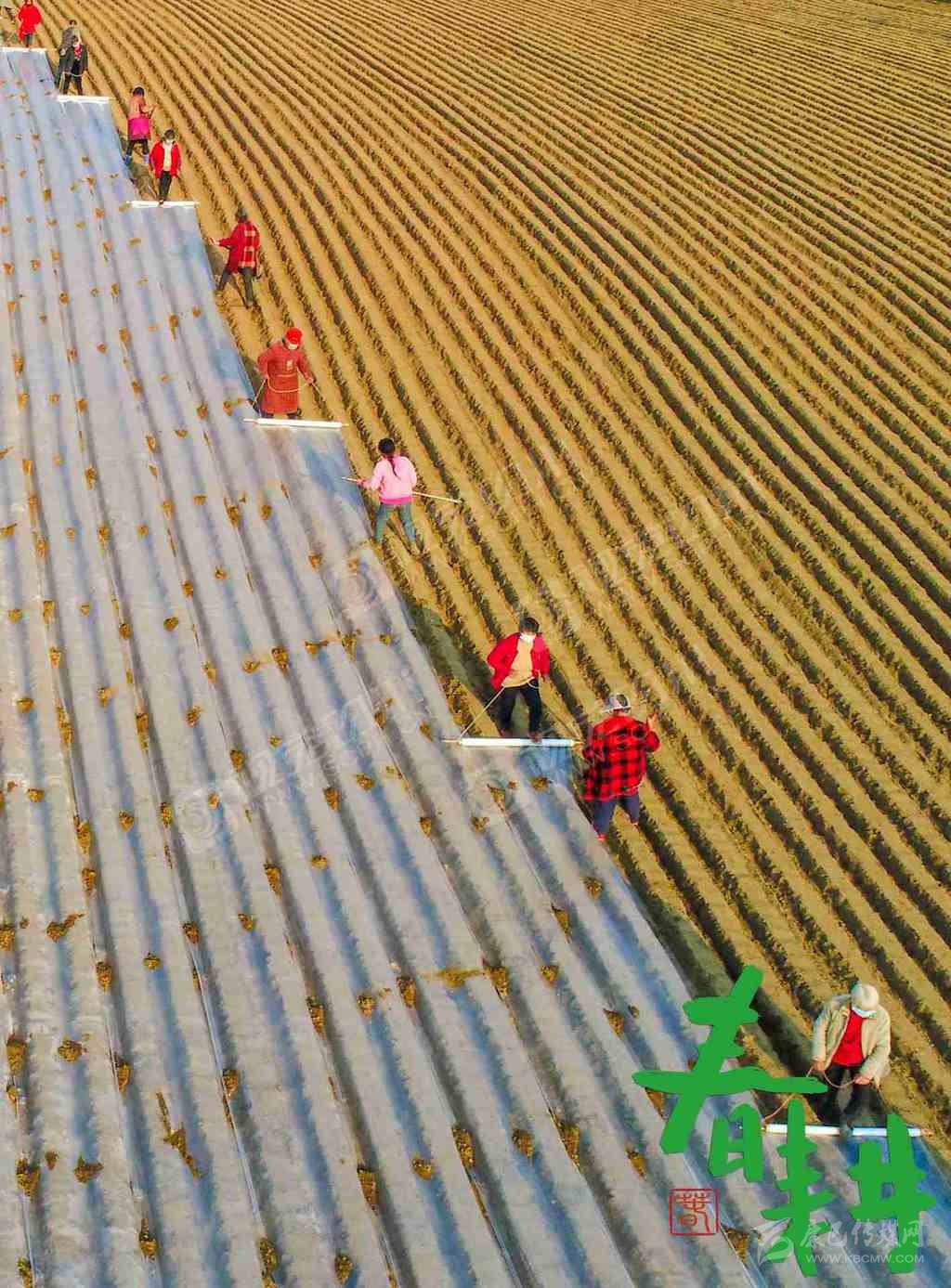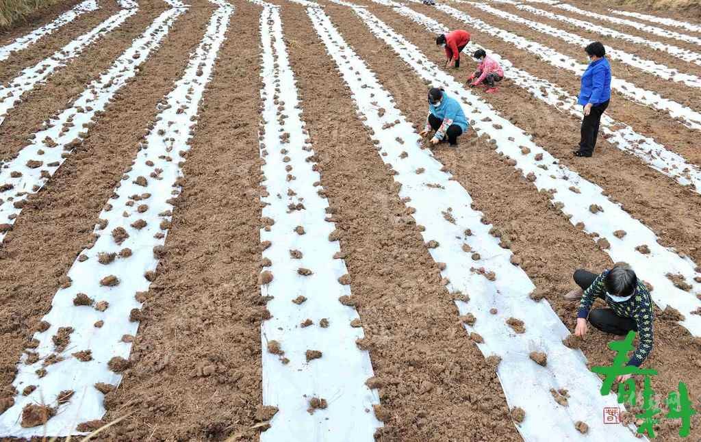 射洪市沱牌鎮(zhèn)桑樹(shù)林村,戴著口罩的農(nóng)戶(hù)正在地里播種、蓋膜。