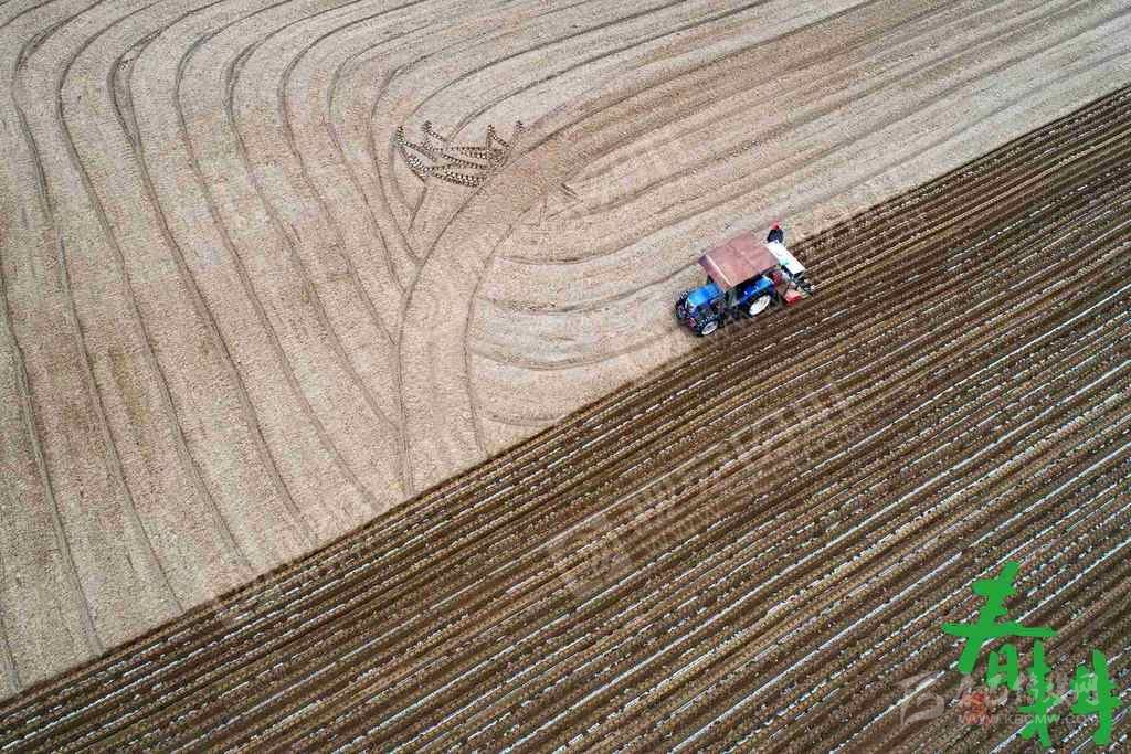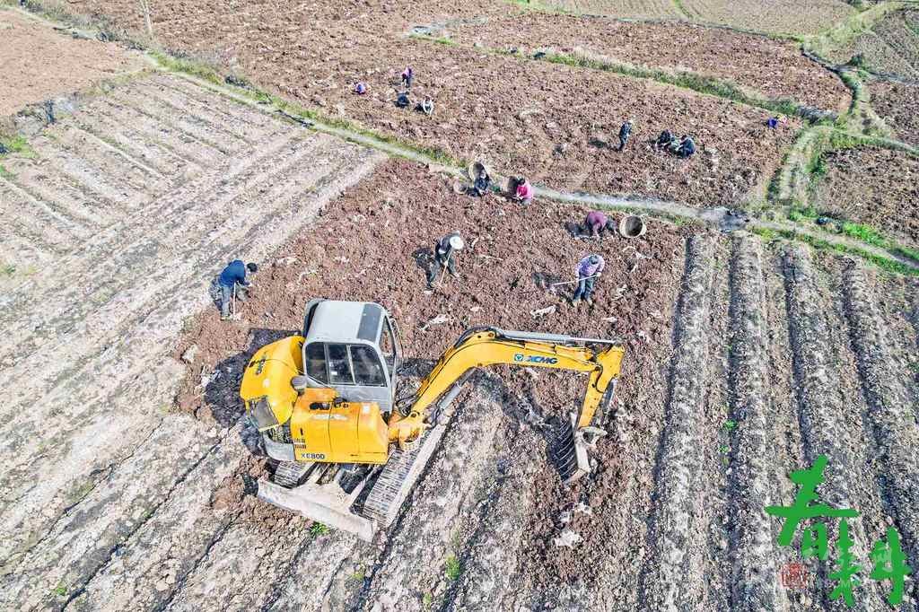 閬中市彭城鎮(zhèn)五谷臺(tái)村,機(jī)械正在菜地里開(kāi)溝起壟施底肥,村民在播種蓋土。