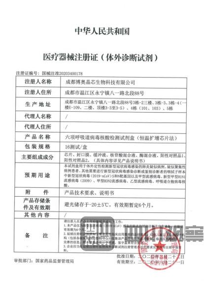 2月22日,國(guó)家藥品監(jiān)督管理局應(yīng)急審批通過(guò)3個(gè)新型冠狀病毒檢測(cè)產(chǎn)品,其中之一的“六項(xiàng)呼吸道病毒核酸檢測(cè)試劑盒”就是鐘院士提到的試劑,而它則是由位于成都溫江的企業(yè)——博奧生物聯(lián)合清華大學(xué)、四川大學(xué)華西醫(yī)院共同設(shè)計(jì)開(kāi)發(fā)的。這款產(chǎn)品正在迅速應(yīng)用到疫情防控前線,為一線提供快速、精準(zhǔn)、有效診斷。