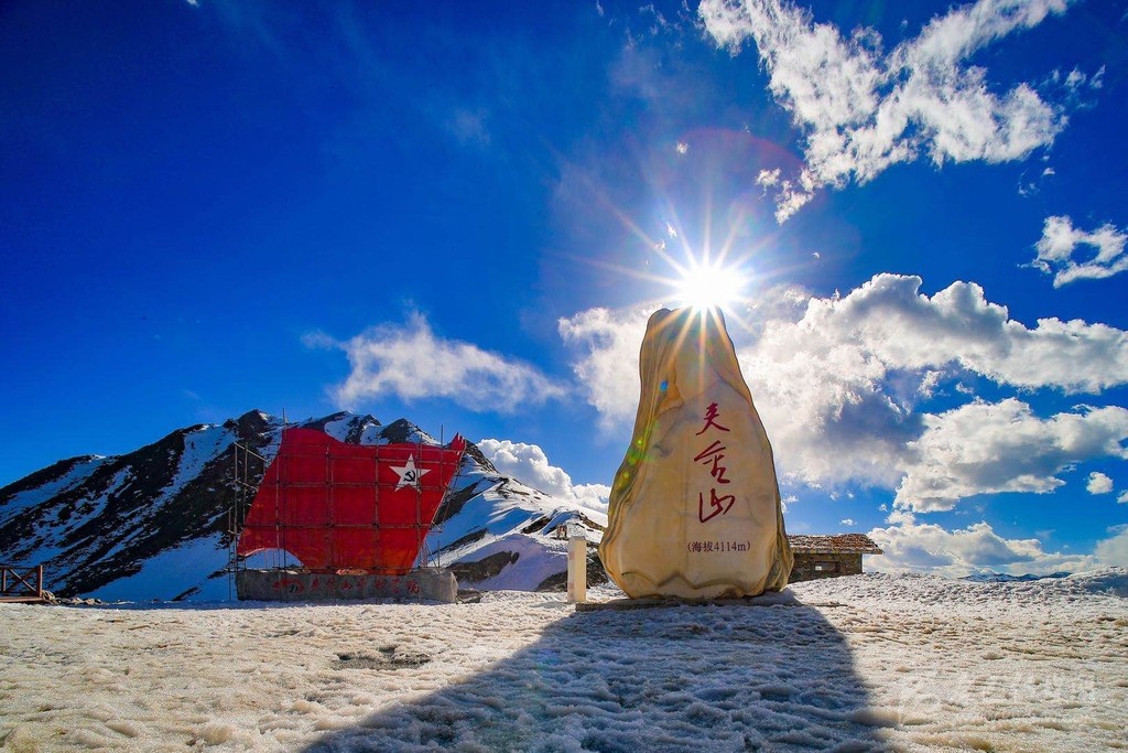 夾金山埡口海拔4114米,山頂終年積雪。美國著名記者索爾茲伯里重走長征路后,在《長征,前所未聞的故事》中曾這樣描寫夾金山:“從山上極目遠(yuǎn)眺,地平線上雪峰兀立,與加拿大的洛基山脈一樣巍峨。頂峰在樹線之上,高聳入云。后來修的公路呈之字形盤旋而上。在這里,所有的綠色都不見了。山成了光禿禿的一片褐黃,不久便是雪的世界。即使在五六月間,也還是厚厚的積雪,一直鋪到峰頂,鋪到雪山的另一邊。”