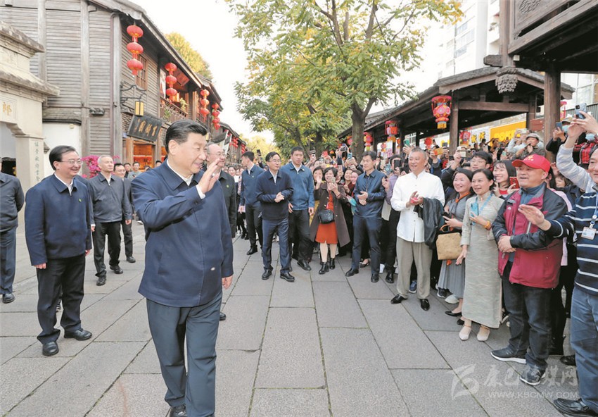 習(xí)近平在福州三坊七巷歷史文化街區(qū)考察時,向游客和市民招手致意。