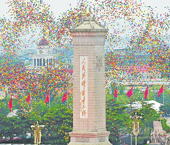 慶祝大會現(xiàn)場放飛氣球。新華社記者李響攝
