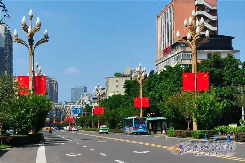 在樂山市,為營造喜慶、熱烈、歡樂、祥和的節(jié)日氛圍,中心城區(qū)嘉定路、柏楊路等多條主干道,以及樂山岷江一橋和二橋共計(jì)1217柱燈桿上,懸掛了2000多面國旗,換上“紅裝”后的街道,在藍(lán)天的映襯下顯得格外美麗。