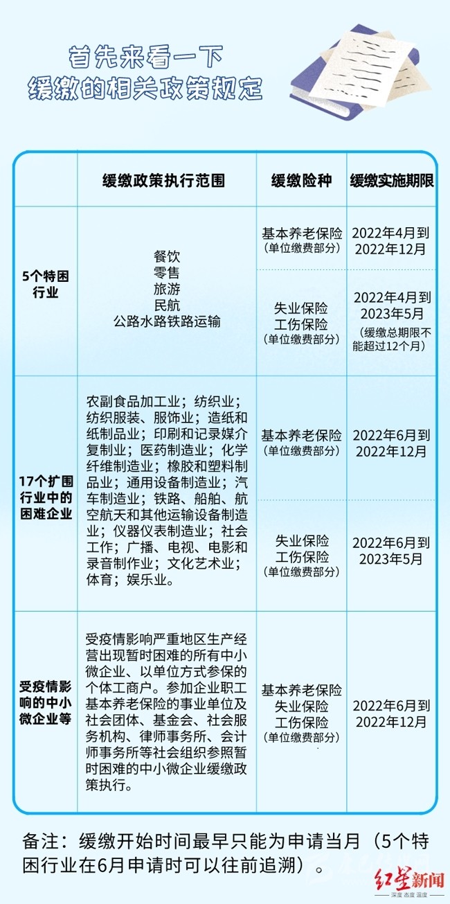 在緩繳期限方面,對(duì)餐飲等5個(gè)特困行業(yè)緩繳養(yǎng)老保險(xiǎn)費(fèi)期限延長至2022年12月31日。對(duì)17個(gè)緩繳擴(kuò)圍行業(yè)所屬困難企業(yè),養(yǎng)老保險(xiǎn)費(fèi)緩繳實(shí)施期限至2022年12月31日,工傷、失業(yè)保險(xiǎn)費(fèi)緩繳期限不超過1年。緩繳期間免收滯納金。