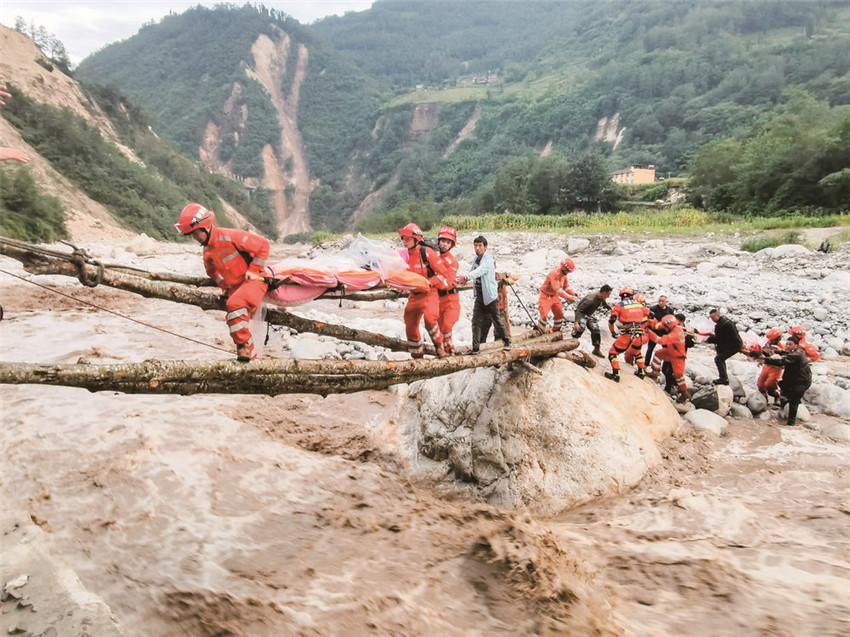 道路中斷、信號中斷,河流上漲、橋梁垮塌。“沒有橋,我們的雙手就是橋?!标P(guān)鍵時刻,四川省森林消防總隊甘孜支隊消防員兵分兩路實施營救。一路“繩為引、步為尺”先期過河救治傷員,一路就地取材急流上用樹干搭起“生命通道”,自制擔架將傷員一一運送過河;截至5日晚23時40分,甘孜森林消防隊員們翻山越嶺往返近7小時,安全轉(zhuǎn)運重傷員24人、近200名群眾,徒步行程18公里。