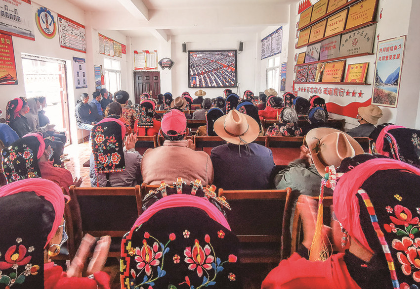 丹巴縣甲居鎮(zhèn)小巴旺村村民身著節(jié)日盛裝,集中收看黨的二十大開幕會。曹松 攝