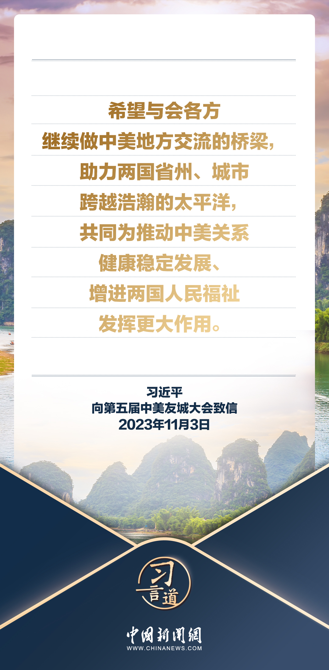 11月3日,國家主席習(xí)近平向第五屆中美友城大會致信。習(xí)近平指出——